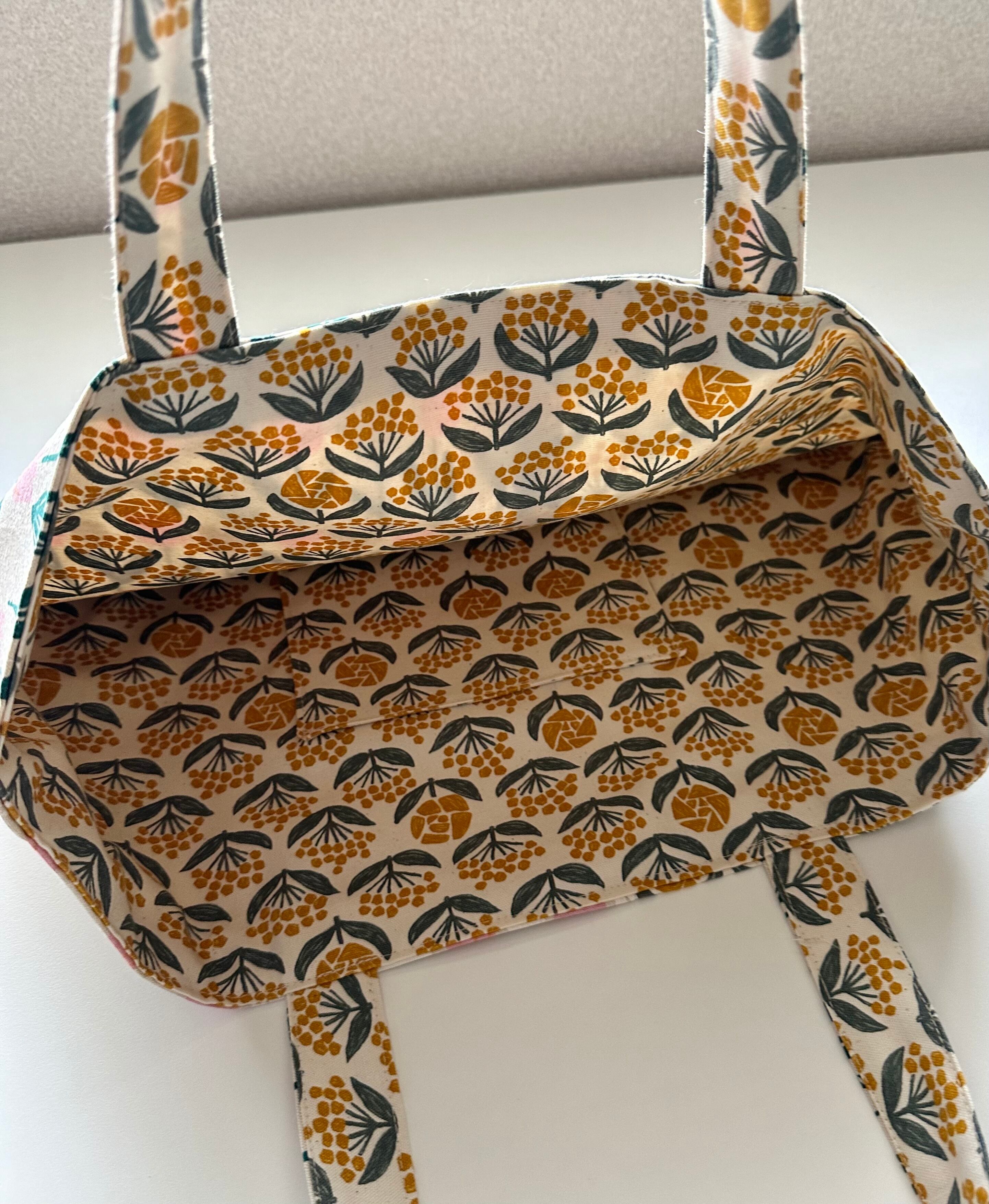 ミモザと黄色のバラが並んでる生地を使用したリバーシブルのバッグです。