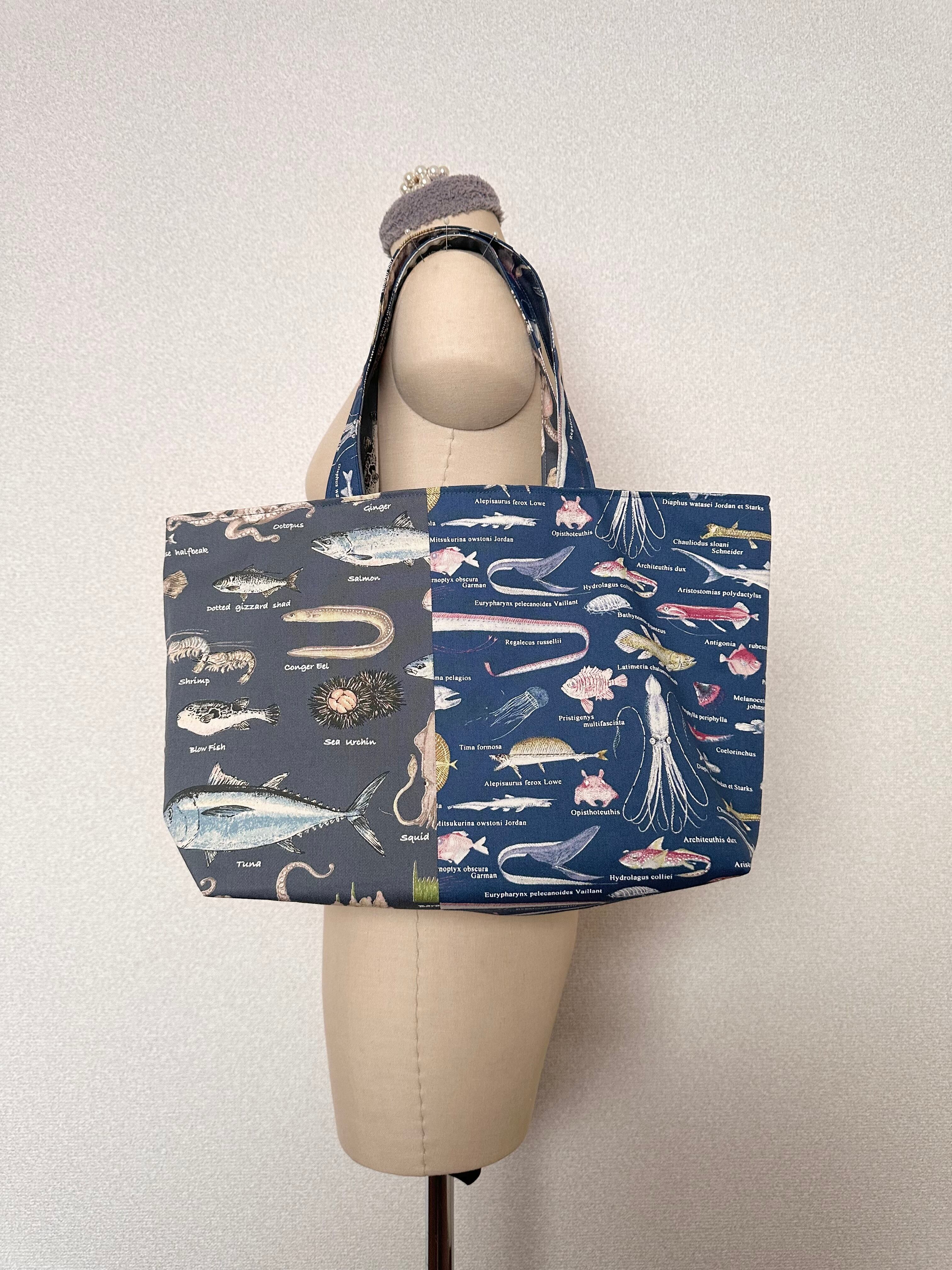魚柄バッグ 水族館 お寿司ネタ 深海魚 リバーシブルバッグ トートバッグ 大きめバッグ